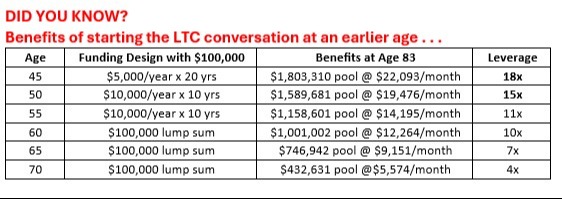 Traditionally, individuals begin planning for long-term care events in their 50s and 60s. This is often when individuals have access to the greatest cash flows, as they are in their peak earning years, their debts are often significantly reduced, and their children have left the nest. Below is a graphic that makes the case for starting to plan for long-term care sooner rather than later.
