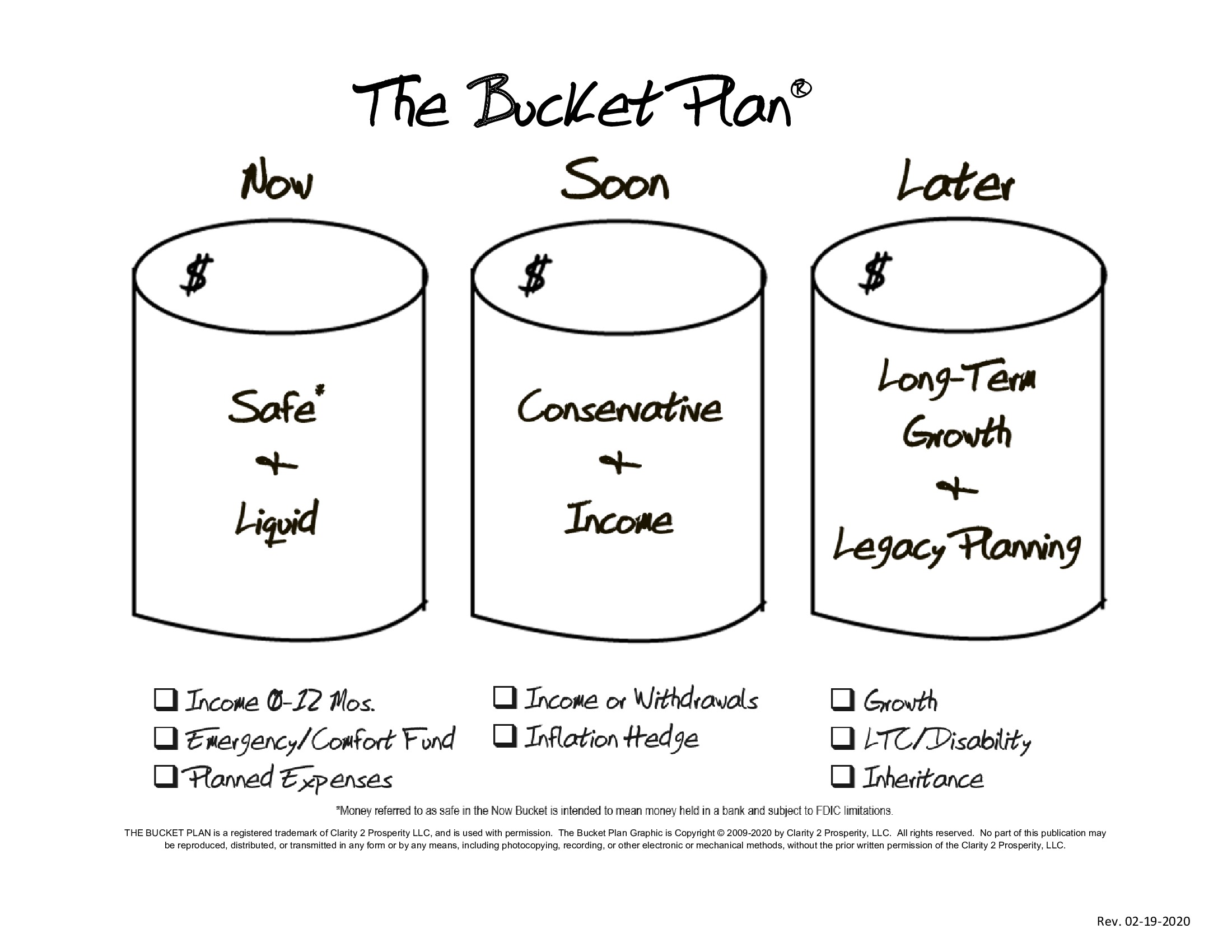 The Bucket Plan is a strategic approach that segments your money into three buckets based on when you need the funds. This ensures you will have money available today and well into the future.