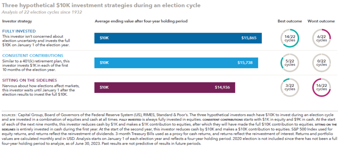 History shows investors have poured into money market funds – traditionally one of the lowest-risk investment vehicles – with more significant frequency ahead of elections. This suggests that investors want to minimize risk during election years and wait for uncertainty to subside before reinvesting. However, market timing is rarely a winning long-term investment strategy and can pose a significant problem for portfolio returns.